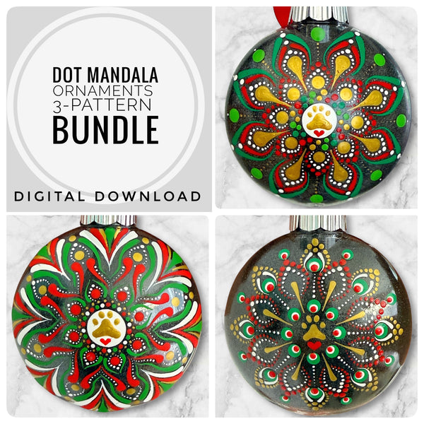 “Jolly Paws” is a 3- pattern collection of “flat” dot mandala designs that I have painted on 3 ornaments in classic Christmas colours. The paw print centre is my favourite detail to add and they have now become a staple of mine, creating new designs every year.