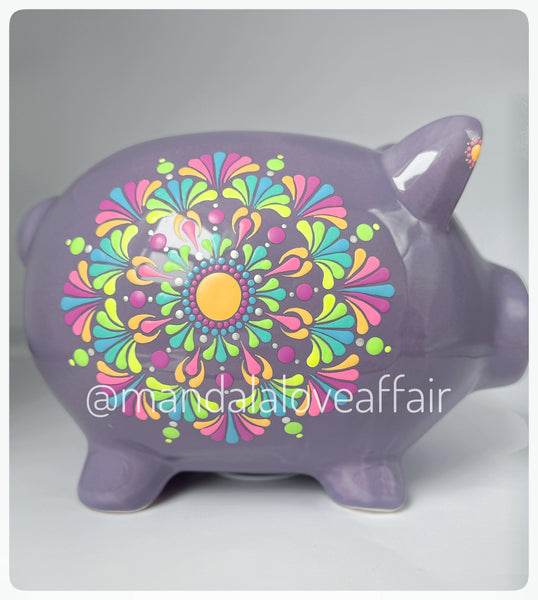 This lavender ceramic piggy bank was painted with black light reactive paint. It has the same dot mandalas design on both sides, but the colour orders are switched, so they’re not identical,  I’ve added a cute little detail on the bum!